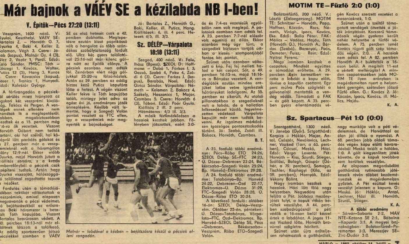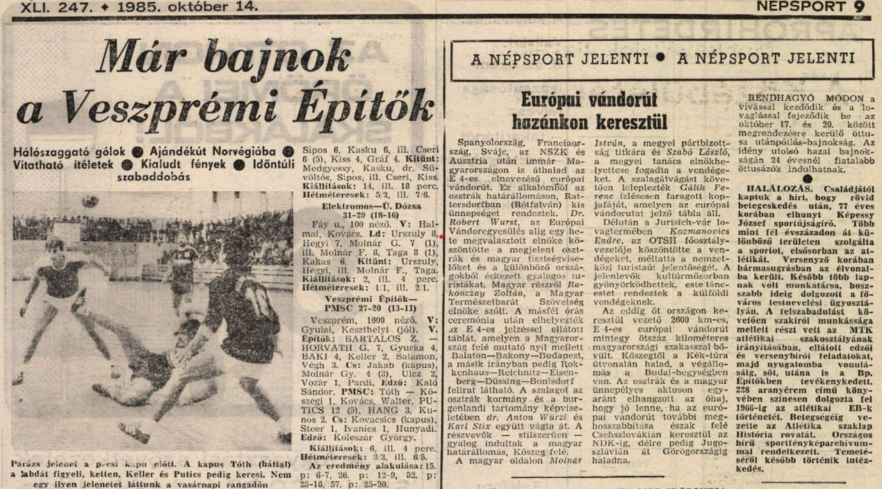 Az úton 1985. október 13-án tették meg elődeink az első lépést. Ma negyven éve, hogy Veszprémi Építők néven a klub megünnepelhette története első magyar bajnoki címét. A Pécsi MSC elleni 27-20-as győzelemmel – csak nem a pályán jött az igazi örömmámor. Mert a nagy rivális Szeged Ferencváros elleni meccse később ért véget, és a matematikai bizonyossághoz kellett a Volán pontvesztése is.